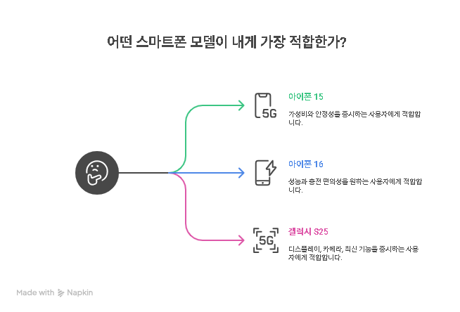 - 갤럭시 S25: 화면 부드러움(120Hz), 다양한 카메라 활용, 빠른 충전과 최신 AI 기능을 원하는 사용자에게 적합